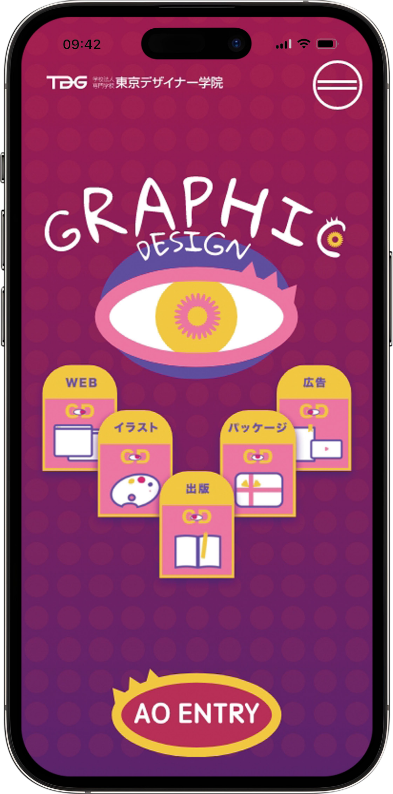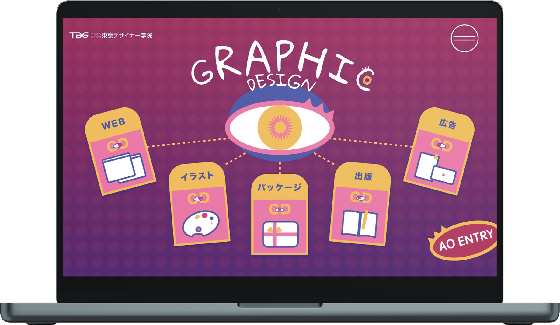 TDGグラフィックデザイン学科の新入生を増やすため、グラフィックデザイン学科のサイトをフルリニューアルしました。 グラフィック学科は視覚でメッセージを伝える学科という視点で、印象に残りやすいために、インパクトのある配色とユニークなイラストを使い、グラフィック学科のイメージを表現しました。